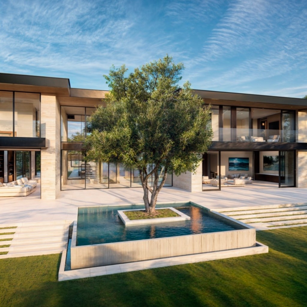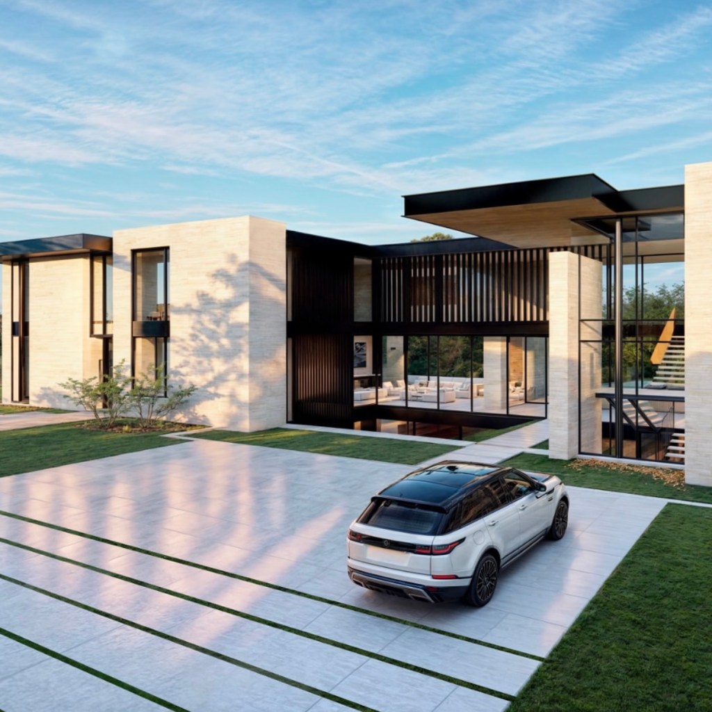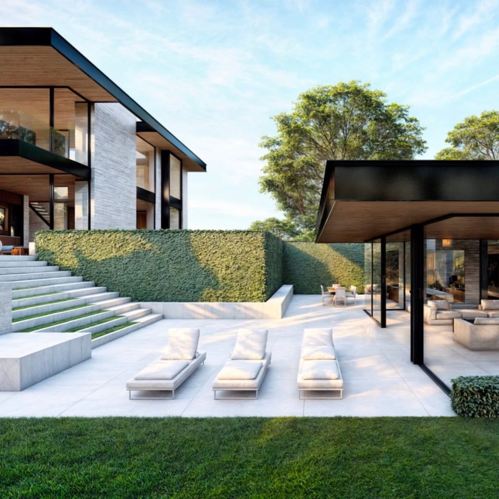 The palette blends modern brick, climate-resistant wood soffits inspired by California style, and black metal accents, provide contrast to the warm tones of the stone and wood.